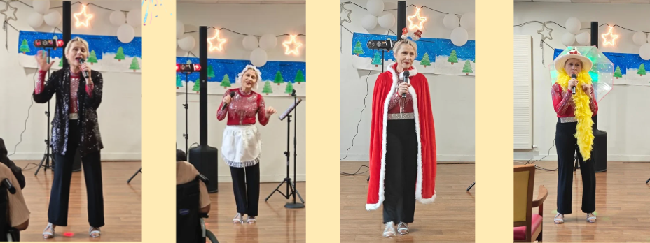 Elle a enchaîné avec talent les grands classiques de Noël, avant de faire vibrer la salle avec des incontournables de la chanson française et des titres plus festifs. Tout au long du spectacle, Dany a su surprendre et ravir les résidents en changeant régulièrement de costumes, créant ainsi différentes ambiances et apportant une touche de magie supplémentaire.